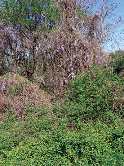 (Left) Aggresive, invasive non-natives can quickly spread, cover, and kill native vegetation, such as this invasion of Asian Wisteria, Japanese Honeysuckle and Multi-flora Rose.